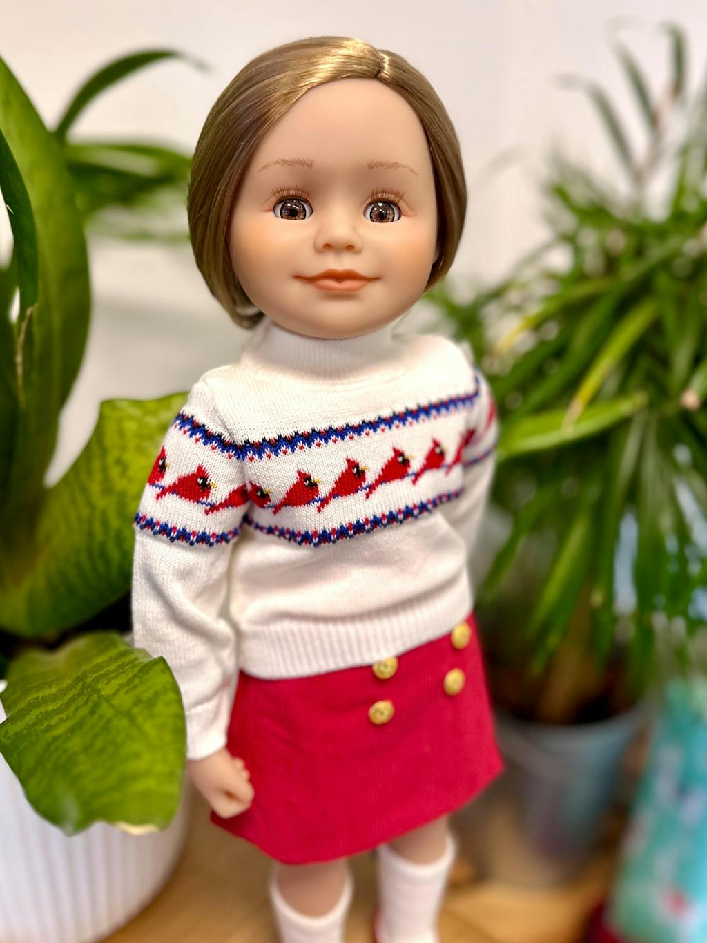 Léonie aime toujours être au top et prend un soin particulier à coordonner ses tenues. Elle porte un haut en tricot doux et détaillé, une jupe-short imprimée amusante et des bottes rouges habillées. Ses beaux cheveux séparés sur le côté sont brun miel et ses yeux sont noisette.