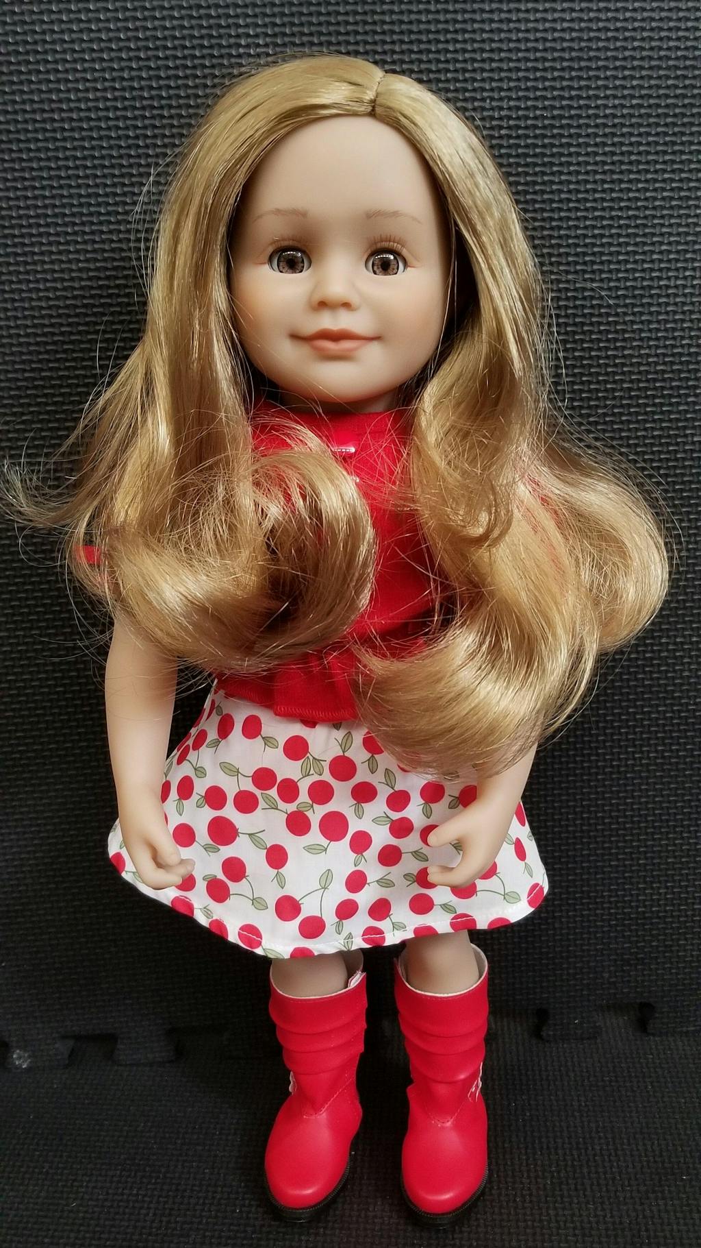 Cette poupée de qualité supérieure mesure 46 cm (18 pouces) de haut avec un corps doux et câlin et des bras et jambes articulés. Ses yeux s'ouvrent et se ferment.