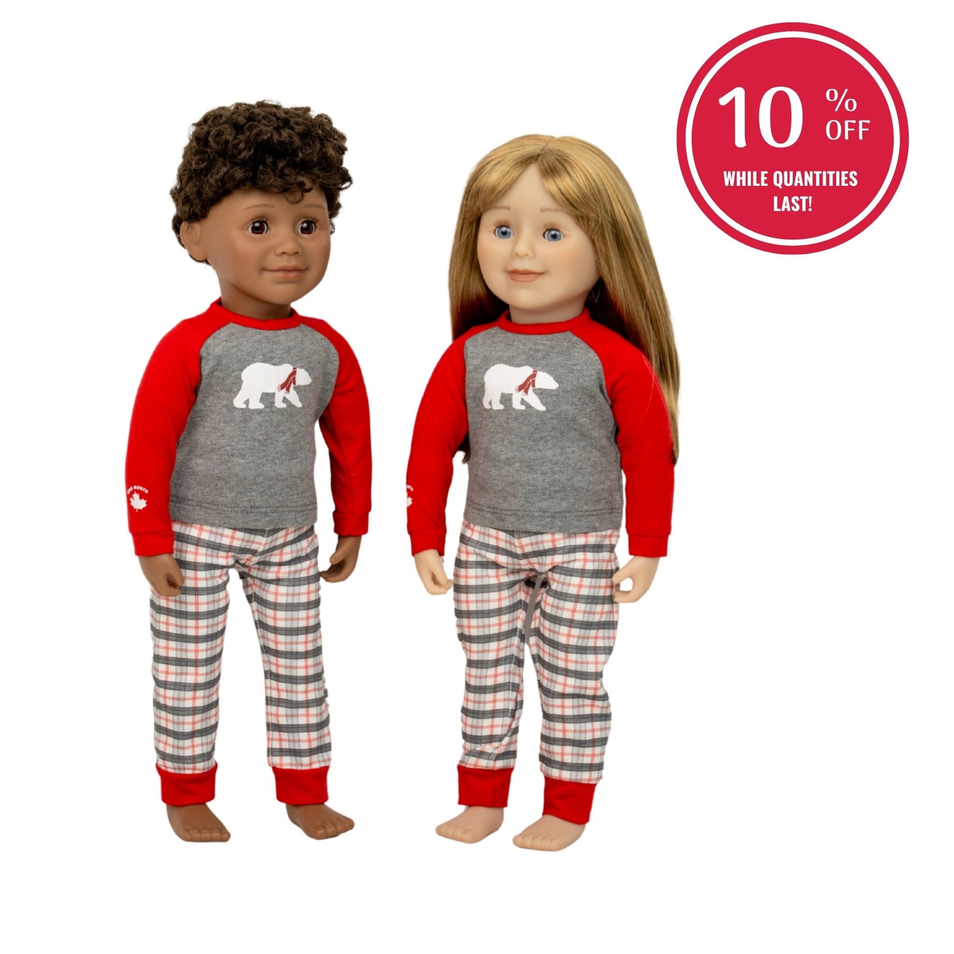 These cozy Polar Plaid two-piece pajamas are made to match the ones available for kids, toddlers, and adults. Now the whole family... and the dolls...can coordinate for those special holiday photos!