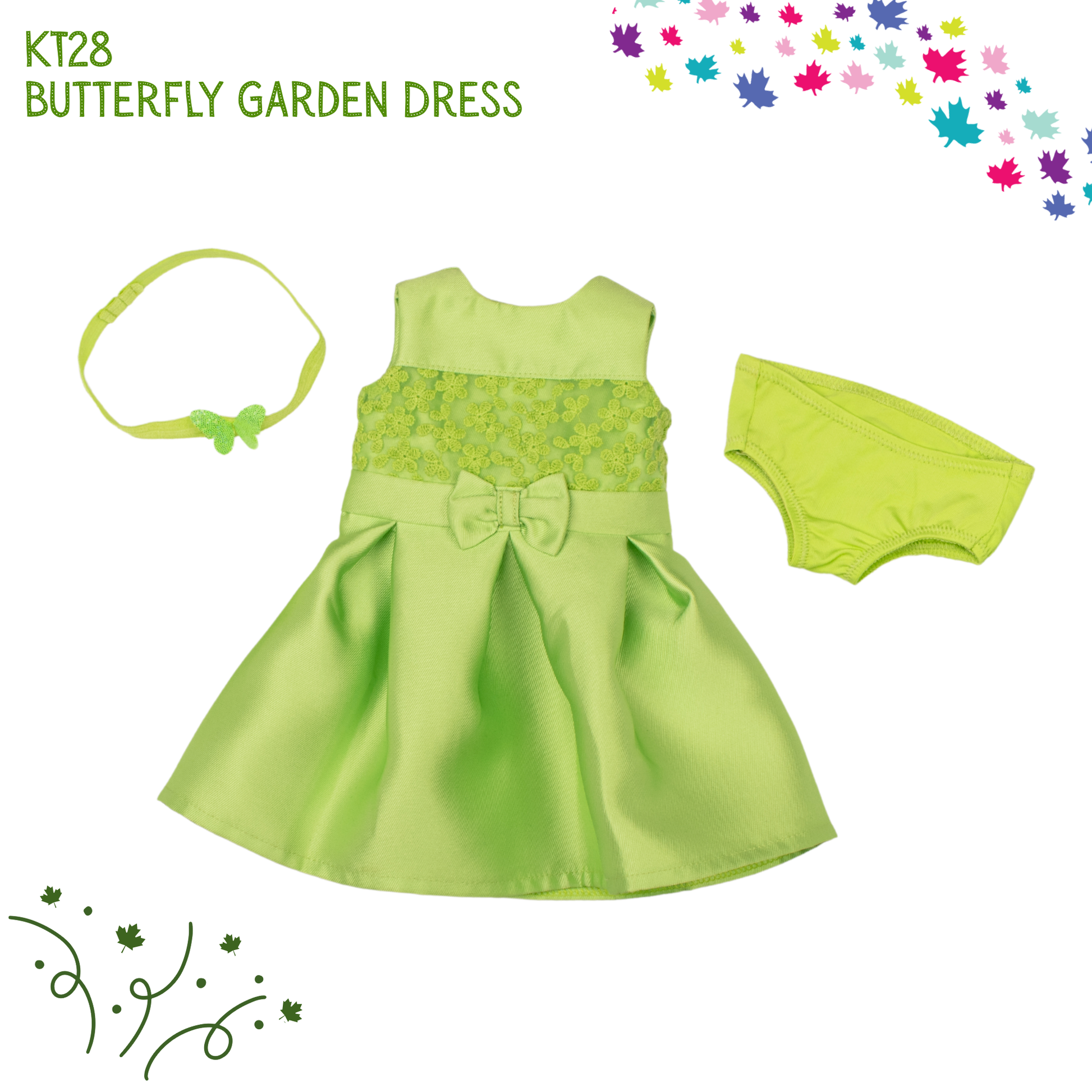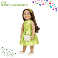 A green dress with lace bodice and pleated skirt, featuring a coordinating butterfly headband, perfect for special moments and twirl-worthy play. -