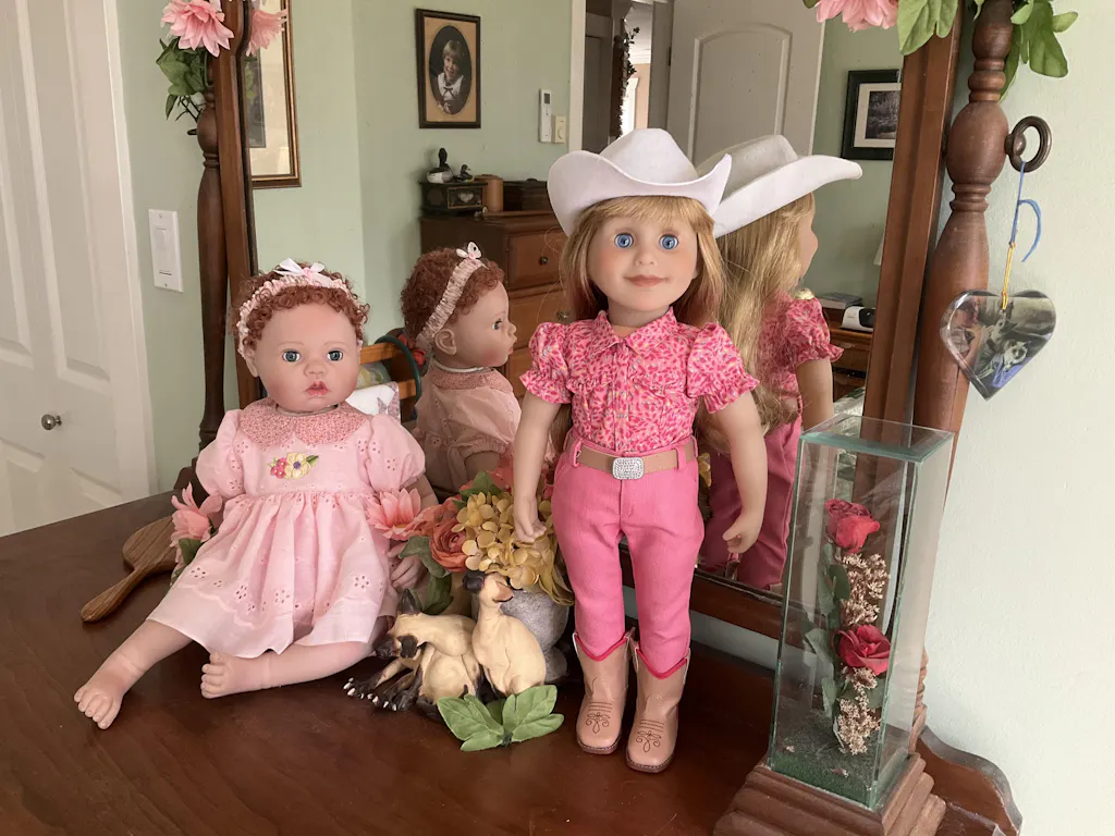 Brianne looks equally at home on the farm or out with family and friends in her western-inspired short-sleeved blouse, pink slim-fit jeans, tan leather-like belt with silver buckle and tan leather-like cowboy boots with pink trim. Brianne has beautiful blue eyes, a light complexion, and long shiny blonde hair with bangs.
