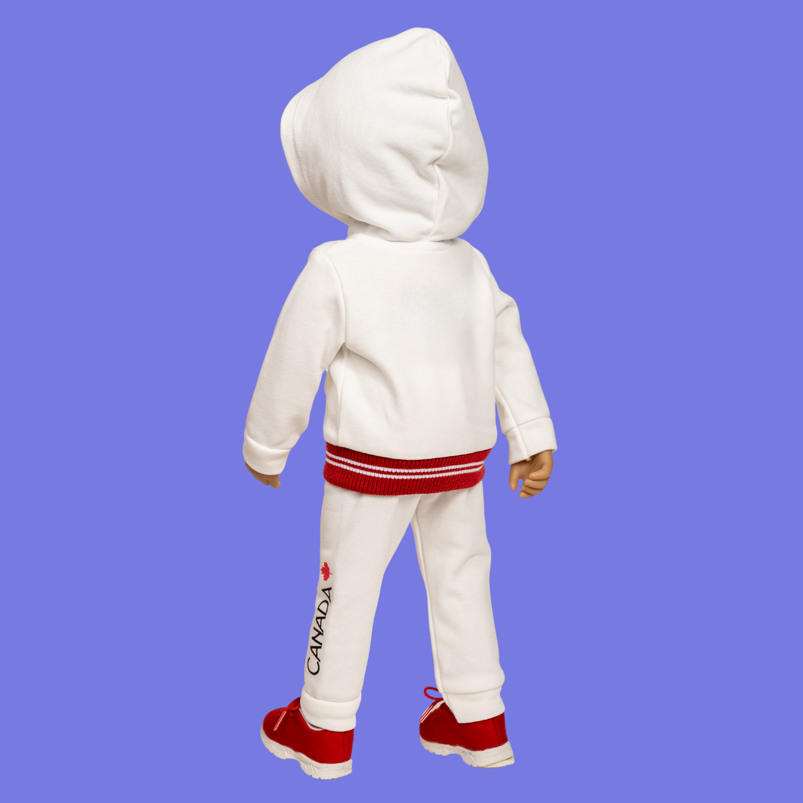 White zip-up hoodie, sweat pants, and red t-shirt are emblazoned with Canadian icons!