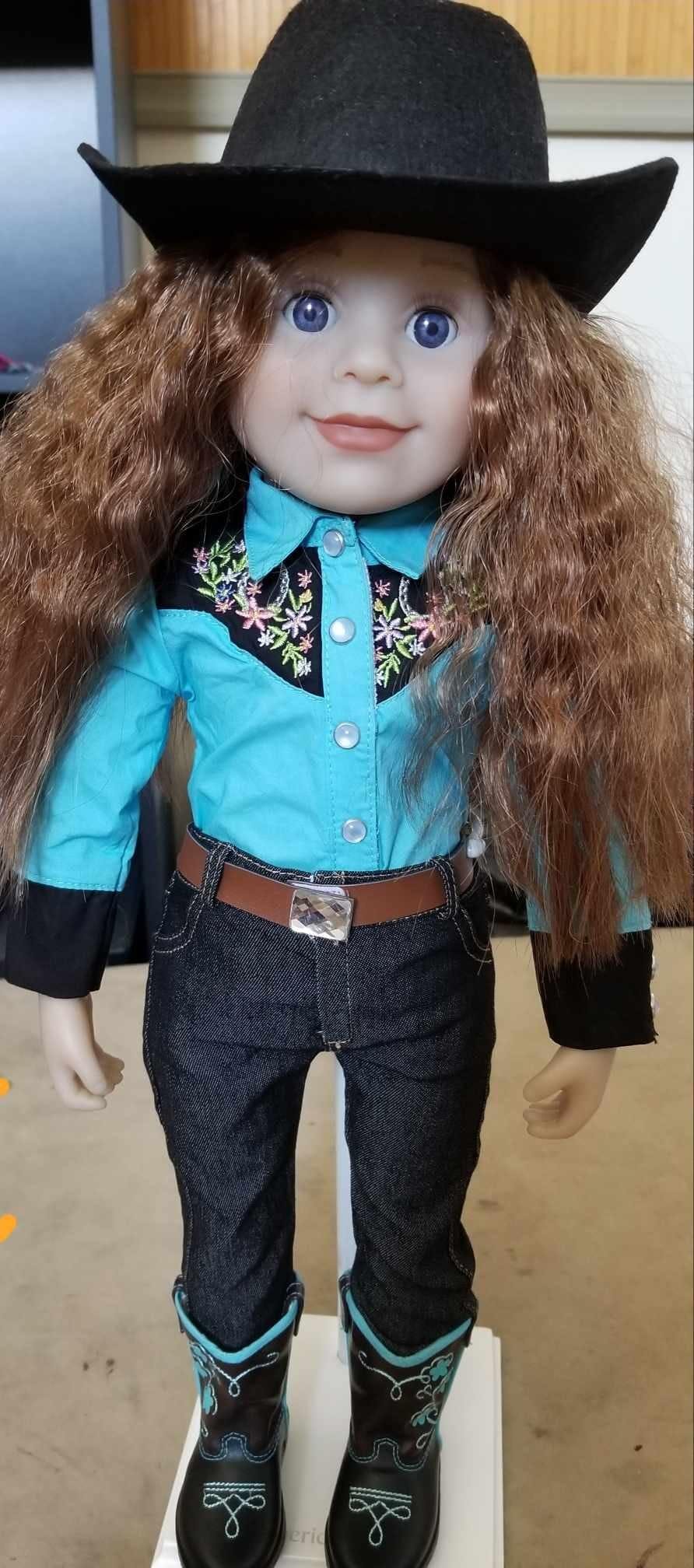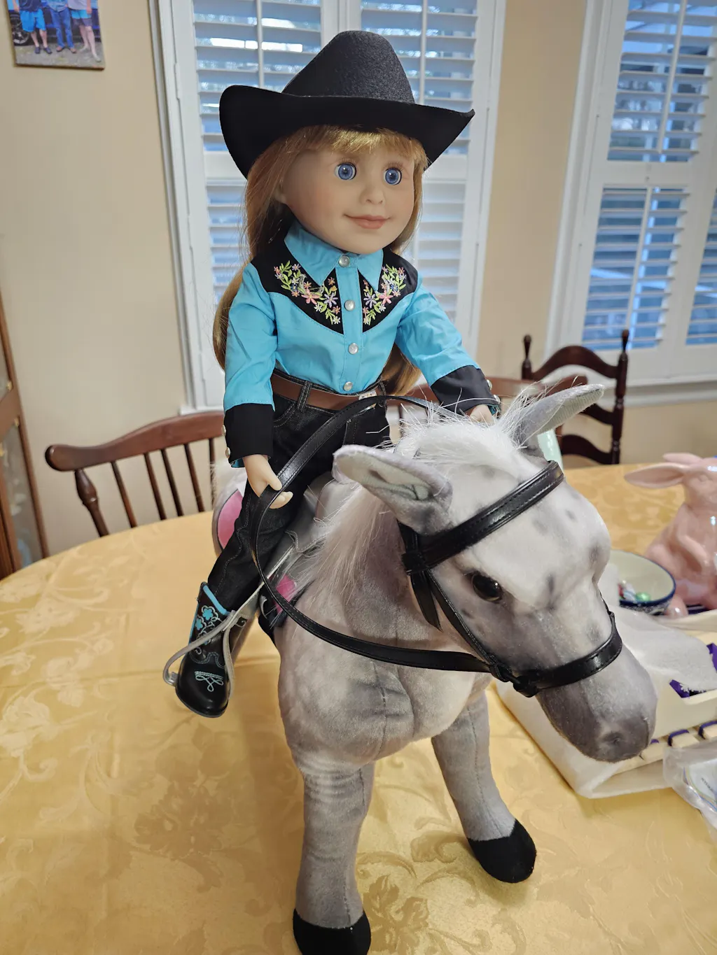 This is a premium quality outfit. The shirt has full embroidery on the front and back, a lined yoke, and white pearl snaps on the front and cuffs, just like real Western shirts. The classic jeans have real pockets and M (for Maplelea!) embroidered on the back pockets. The boots have stitched and appliquéd detail with Velcro on the back seam for easy on/off.