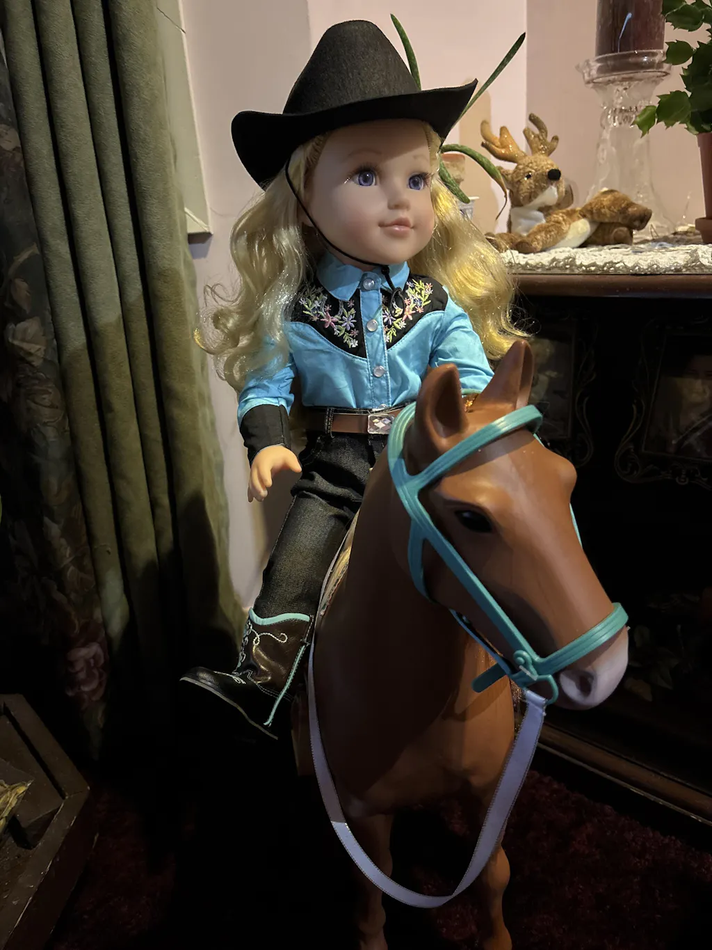 This is a premium quality outfit. The shirt has full embroidery on the front and back, a lined yoke, and white pearl snaps on the front and cuffs, just like real Western shirts. The classic jeans have real pockets and M (for Maplelea!) embroidered on the back pockets. The boots have stitched and appliquéd detail with Velcro on the back seam for easy on/off.