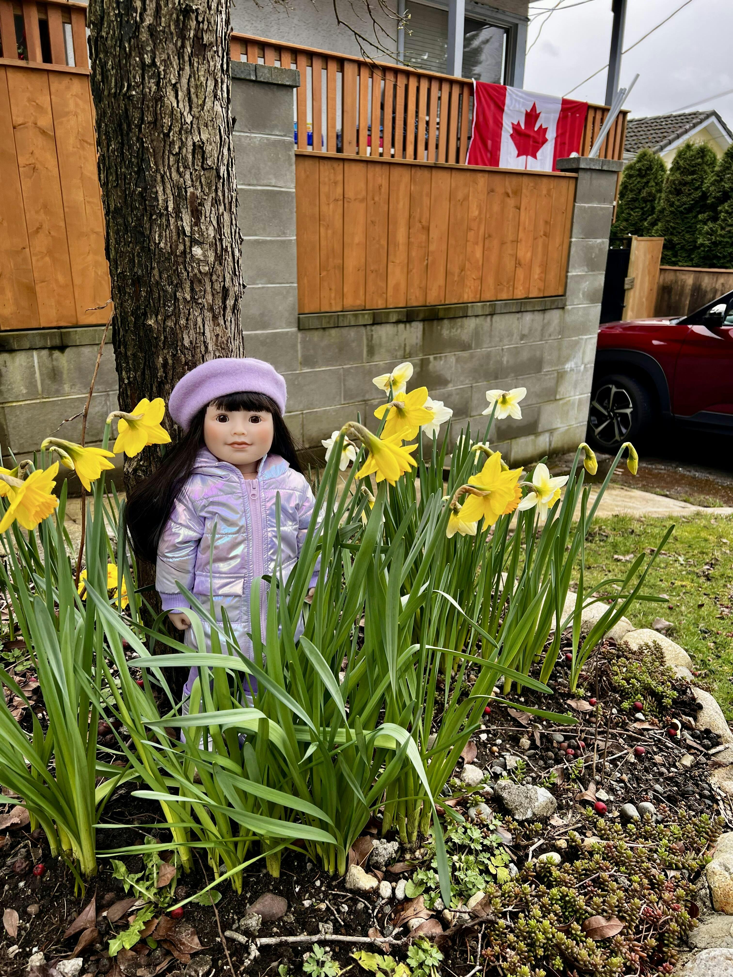 This shimmery coat and moon boots keeps her warm and feeling like a shiny star herself, glimmering in the night sky. She pairs it up with light purple leggings and a felt beret.