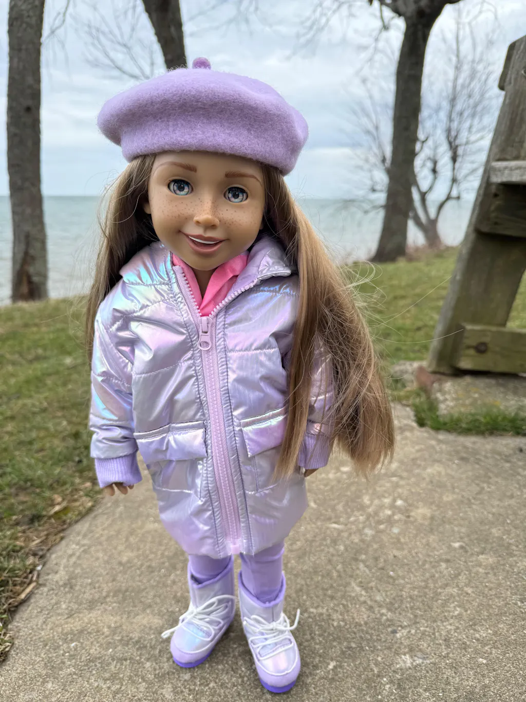 This shimmery coat and moon boots keeps her warm and feeling like a shiny star herself, glimmering in the night sky. She pairs it up with light purple leggings and a felt beret.