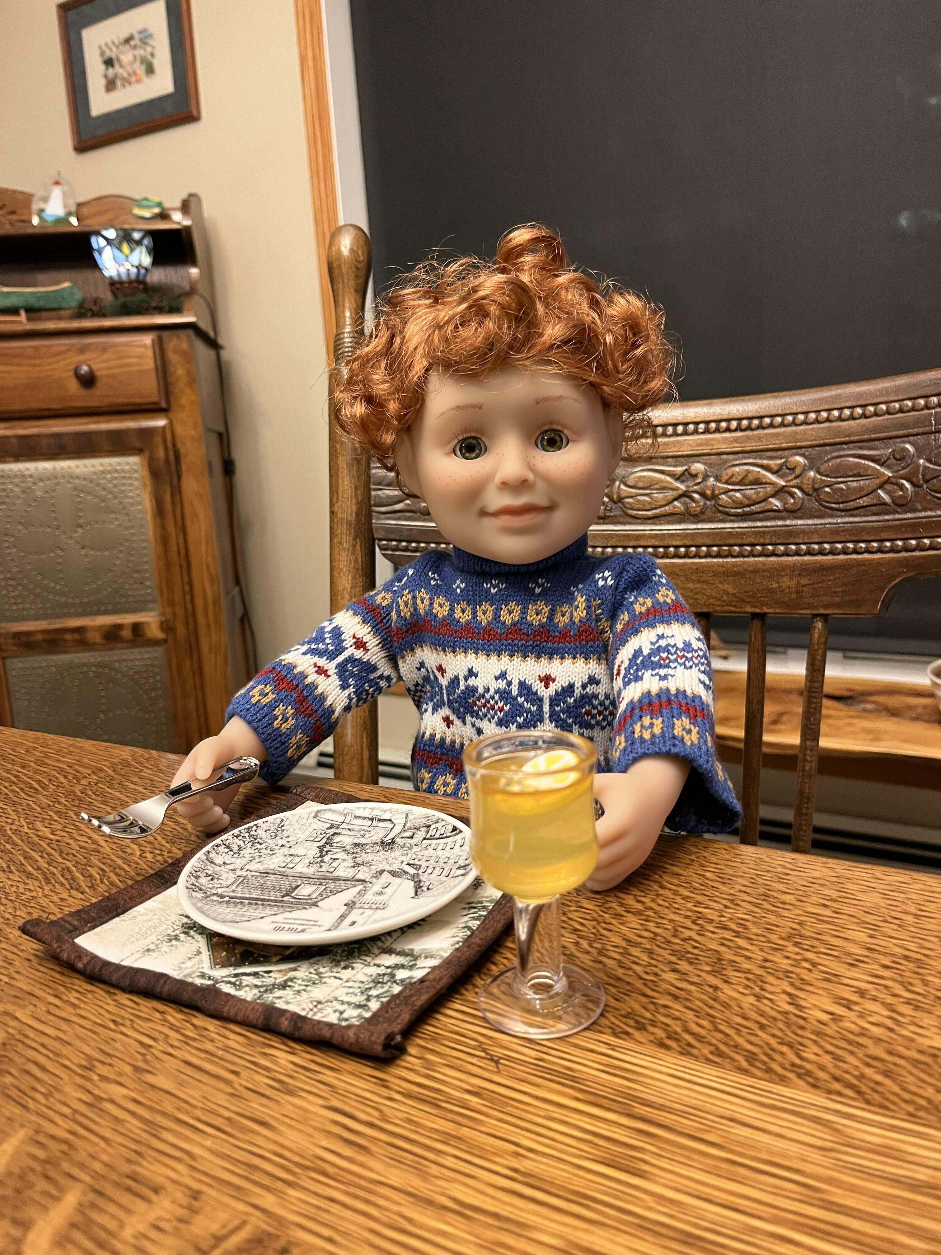 This Maplelea&ME! doll has short loosely curled red hair, hazel-green eyes, freckles, and medium-light complexion. Doll comes dressed in a long sleeve tee, track pants, a quilted vest, and slip-on shoes.