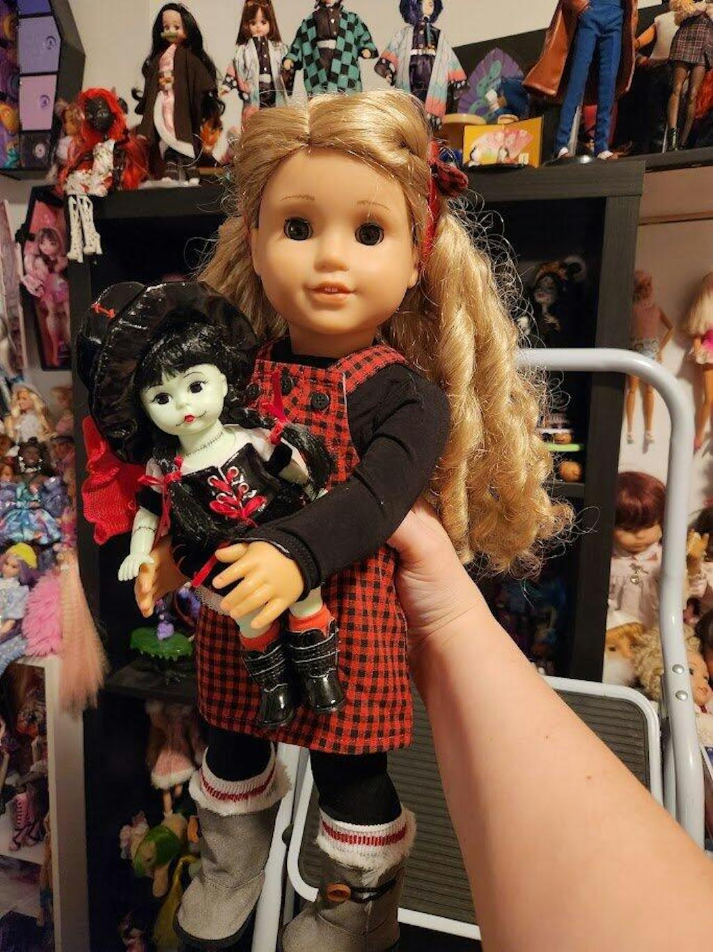 This is the perfect festive doll outfit for dressy or casual occasions. This red and black buffalo plaid jumper has tiny buttons down the front, a long-sleeve top, footless tights and the most gorgeous red suede-like boots adorned with fringes. Top it off with the matching elastic headband with coordinating plaid bow.