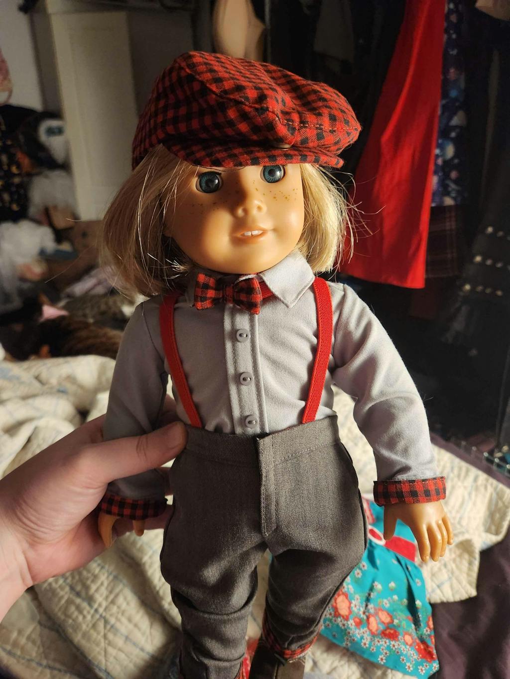 Buffalo plaid doll outfit with shirt, pants, socks, bow tie & cap!