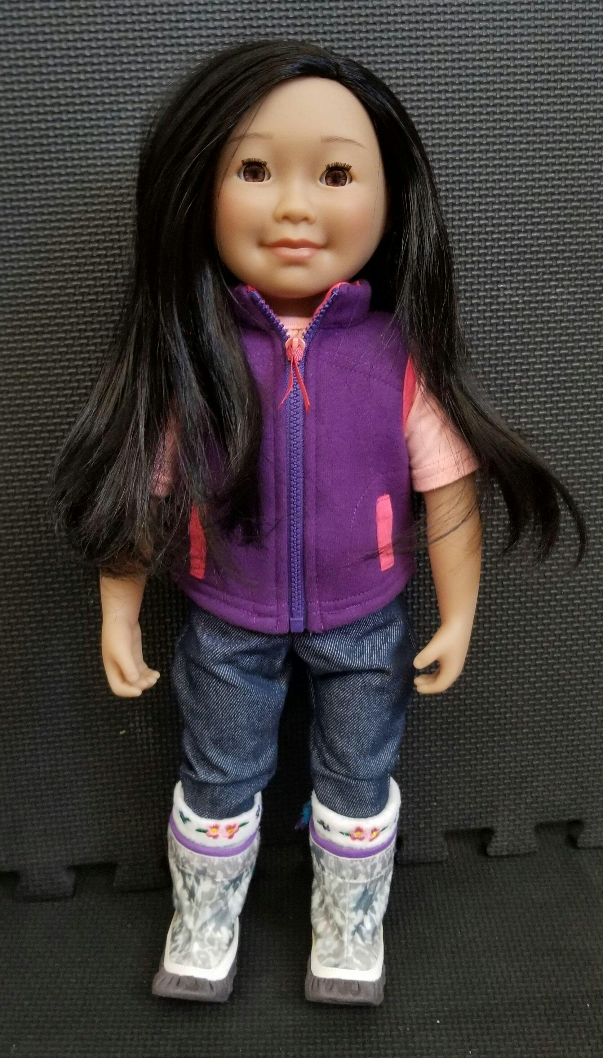 This premium quality doll is 46cm (18 inches) tall has a soft, huggable body and poseable arms and legs. Her eyes open and close. She has dark black-brown hair, brown eyes and medium dark complexion.
