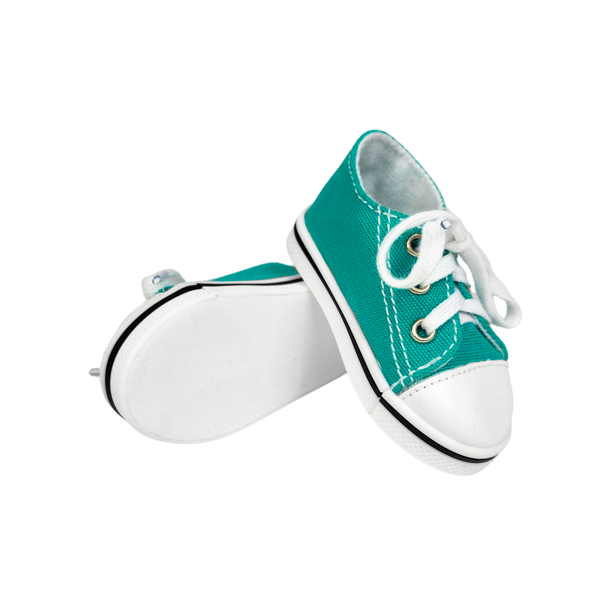 Lined with white on the inside, with laces that thread through the metal grommets, these colourful teal runners fit perfectly on all 18-inch dolls.